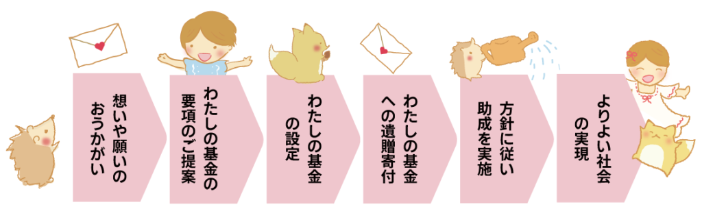 遺贈寄付にあたっては、想いや願いをしっかりと受け止め、その想いを実現するために、「わたしの基金」を創り、その基金に寄付するという形での「遺贈寄付」をご提案いたします。