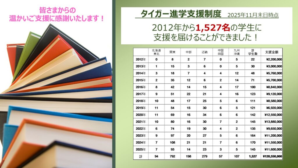 2012年からこれまでに、のべ1,527名の学生たちに、総額1億2,055万円の支援金を届けることができています。皆さまのご支援に改めて感謝申し上げます。