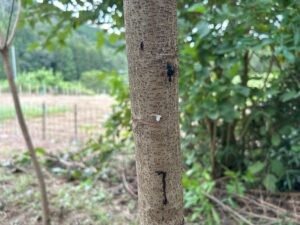 検査機関からの要請では、検査に必要な漆は最低350mlと言われています。理想は1,000mlです。まだ若木のため、シーズン内に採取できる漆の量は1本あたり10ml程度と想定して、35本~100本ほどの本数の漆搔きが必要となります。漆搔きは木に傷をつける毎に4日以上休ませながら約6カ月間にわたって採取していかなければなりません。