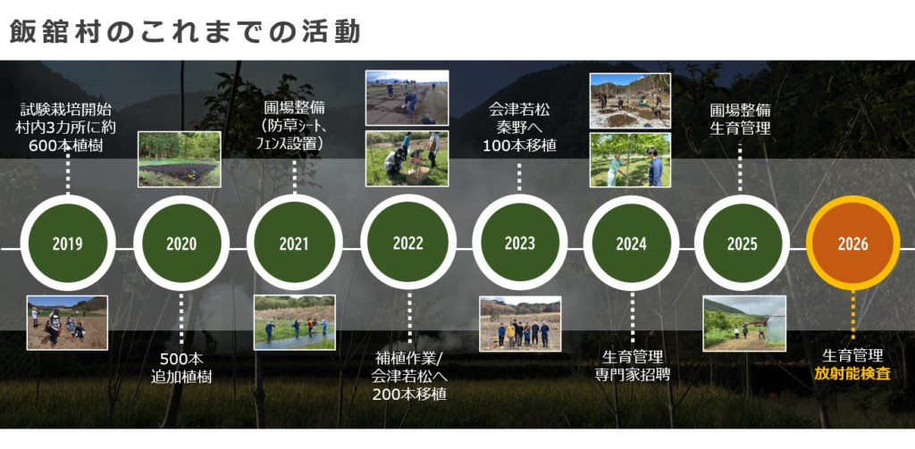 今回の事業の対象となる福島県飯舘村は、皆さまのご支援のおかげで試験栽培も順調に進んでおり、若木ながら漆が出る可能性のある木になるまで育てることができました。ここで植栽当初より懸念していた原発事故による安全性の確認のために、放射能検査を実施したいと考えております。