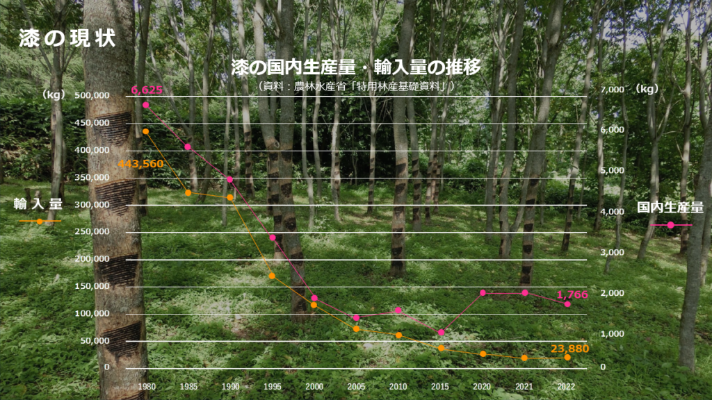 縄文時代から日本人の生活を、国の宝を、文化・芸術を支えてきました。しかし、残念ながら、その国産漆の生産量は、1980年には6.6トンありましたが、2022年には1.8トンにまで減少しています。輸入量も激減していますが、それでもなお、需要の大半を中国産漆に依存しているのが現状です。
