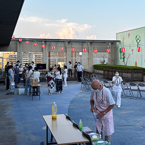 この日は風がとても強く、あちこちで書類や景品が舞い上がるハプニングもあったものの、開始時間までにはすべてのブースで準備が終わり、病棟の屋上はすっかり夏祭り会場に様変わりしました。