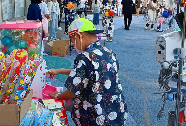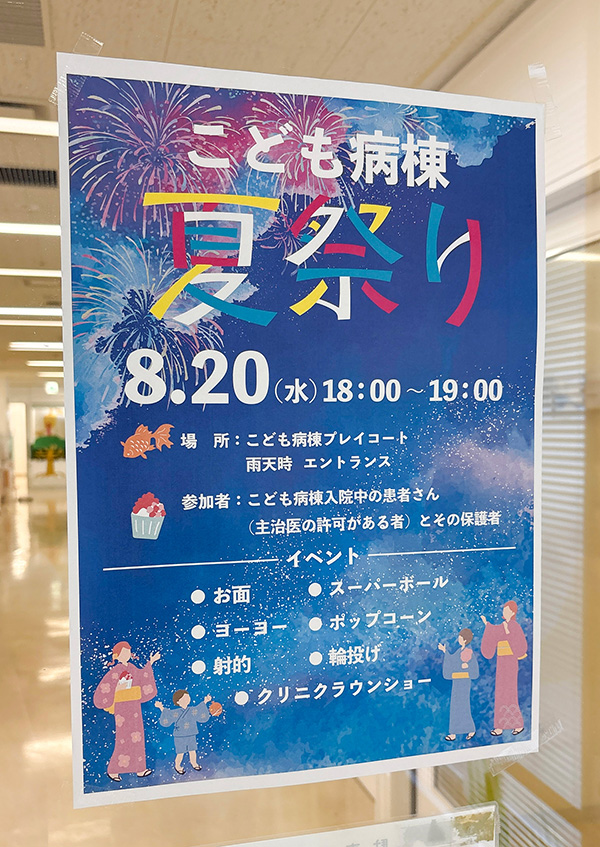 夏祭りはこども病棟に入院中の子どもとその保護者を対象に行われ、看護師やボランティアの方により、お祭りの屋台のような形で様々な体験が用意されます。