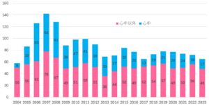 心中による虐待死は2006年の65件、2007年の64件以降、減少傾向にあります。その一方で心中以外による虐待死は、2007年の78件に比べれば減少しているものの、ここ数年50件台で推移しており、ほぼ横ばいとなっています。