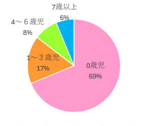 心中による虐待死は様々な年齢の子どもが被害者となっていますが、心中以外による虐待死は、0歳児が約7割、3歳未満が8割を占めており、幼い子が犠牲になっています。