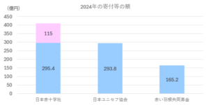 寄付先として突出して大きいのは、日本赤十字社、日本ユニセフ協会、赤い羽根共同募金です。2024年にはこれら3団体に合計で870億円が寄付等として寄せられました。個人の寄付の一割強を3団体で占めているのです。