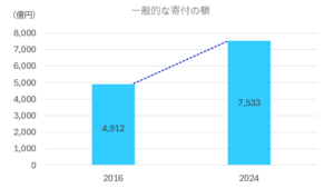 2016年の一般的な寄付額は4,912億円であったことから、この8年間で約1.5倍に増加していることになります。