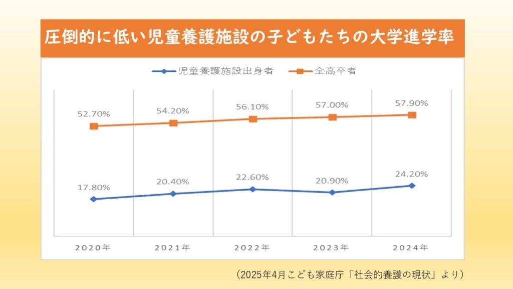「こども家庭庁」が2025年4月に公開した「社会的養護の現状」の資料によると、全高卒者の57.9%が大学等に進学している現在、児童養護施設の子どもたちの進学率は24.2%にすぎません。