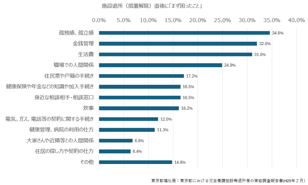 また、東京都のケアリーバーへの調査※2では、自立した直後に「まず困ったこと」として挙げられたうちの2位が「金銭管理(32%)」、3位が「生活費(31%)」となっています。回答者のうちの3人に1人が、自立後にまず「金銭管理」と「生活費」に困っていることが分かります。