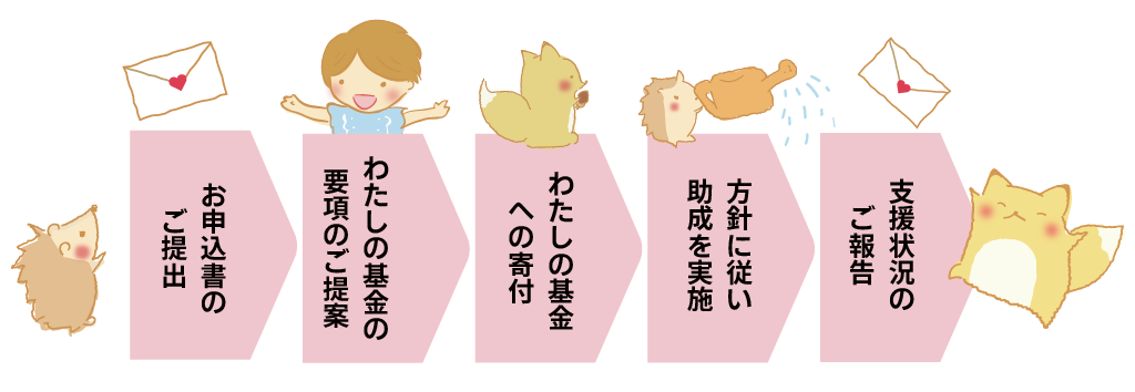 「わたしの基金」の創設をご希望の方は、まずお申込書をご記入のうえ、ご送付またはメールにてご送信ください。ご記載いただいた思いや願いをもとに、事務局から助成方針や助成の方法など基金の要項をご提案させていただきます。要項が固まりましたら、「わたしの基金」へのご寄付をお願いいたします。